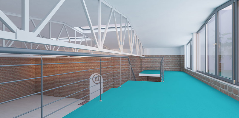 Unser Zentrum im Innenhof erhält eine besondere Wand- und Bodengestaltung, welche durch einen exklusiven Charme beeindruckt. Die große Fläche von 320 m² verteilt sich auf drei Ebenen. Die Räumlichkeiten sind lichtdurchflutete Lofts. Sie umfassen eine massive Empore und zwei große Terrassen. Das helle Loft mit den hohen Decken und großzügiger Fensterfront bietet mehrere Funktionen für unterschiedliche Bedarfe. Die echten Backsteine des Mauerwerks verleihen der Räumlichkeit einen eindrucksvollen, ästhetischen und modernen Charakter.
